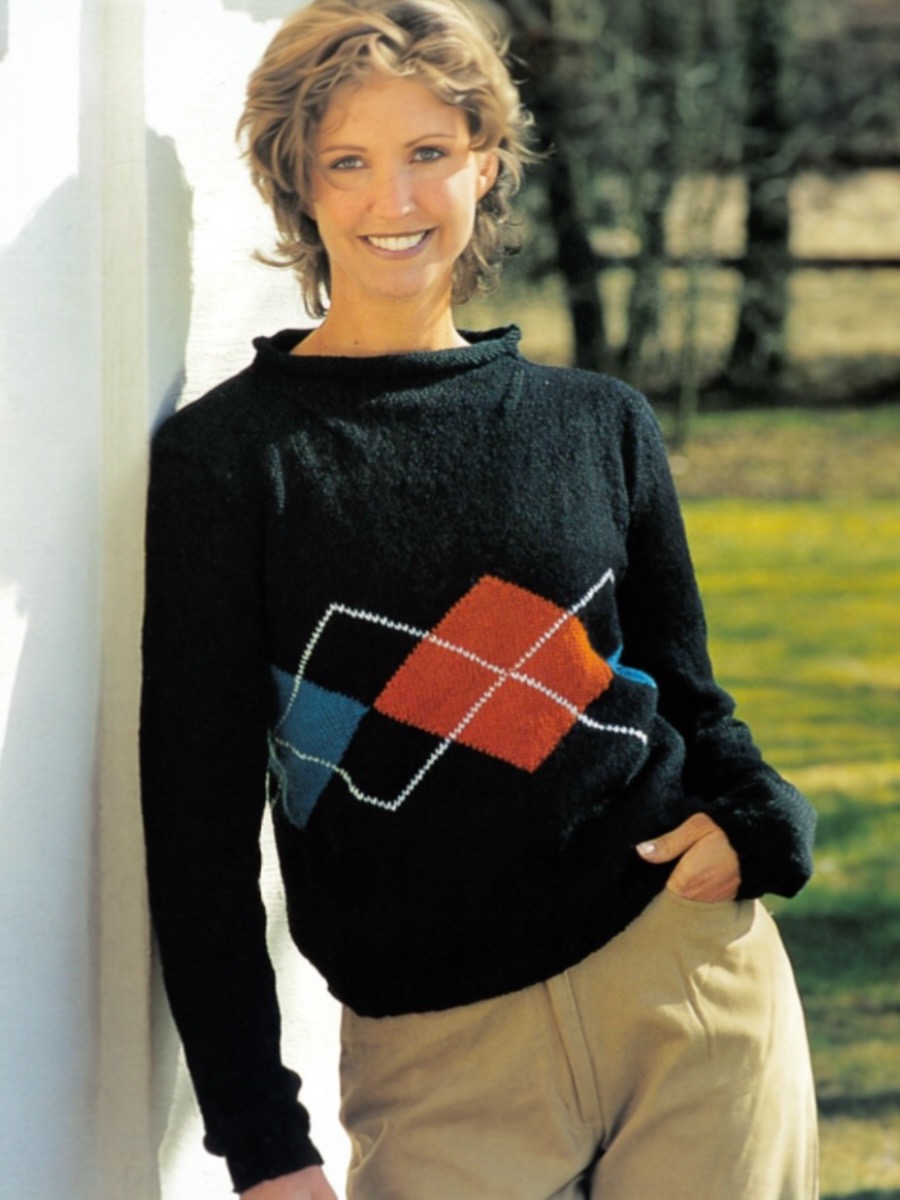 Denna jumper med harlekinrutor. Bak- och framstycke börjar med en resår innan man byter stickor för slätstickning. Mönstret skapas genom att följa diagram för färgbyte och brodera detaljer med maskstygn i efterhand. Ärmarna stickas separat och sys fast efter att axelsömmarna slutits.