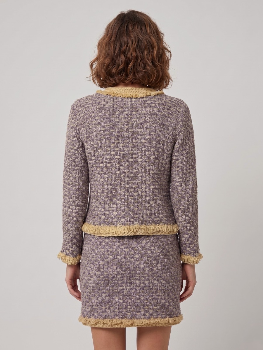 Skapa en tidlös och sofistikerad look med detta set som består av en klassisk jacka och kjol i en vacker tweedliknande textur, stickad med ett mjukt garn i 100 % återvunnen ull. Designen utmärks av dekorativa kanter med öglemaskor i kontrastfärg, vilket ger plaggen en elegant inramning och en lyxig känsla. Jackan pryds av stilrena knappar och nätta fickdetaljer, medan kjolen har en bekväm resår i midjan för optimal passform.