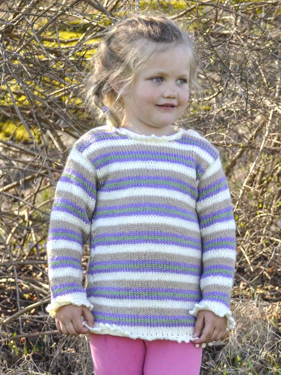 Jumper som stickas runt i slätstickning med randning, delas vid ärmhål och formas med minskningar. Fram- och bakstycke samt ärmar sys ihop. Hals- och ärmkanter stickas separat och avslutas med knappar.