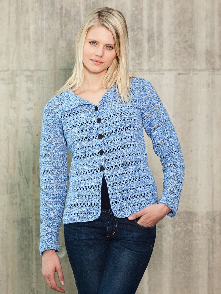 En stilren, virkad kavaj i hundra procent bomull. Mönstret bygger på en kombination av stolpar och dubbelstolpar som bildar ett elegant hålmönster. Kavajen har en klassisk passform med krage och knäppning framtill.