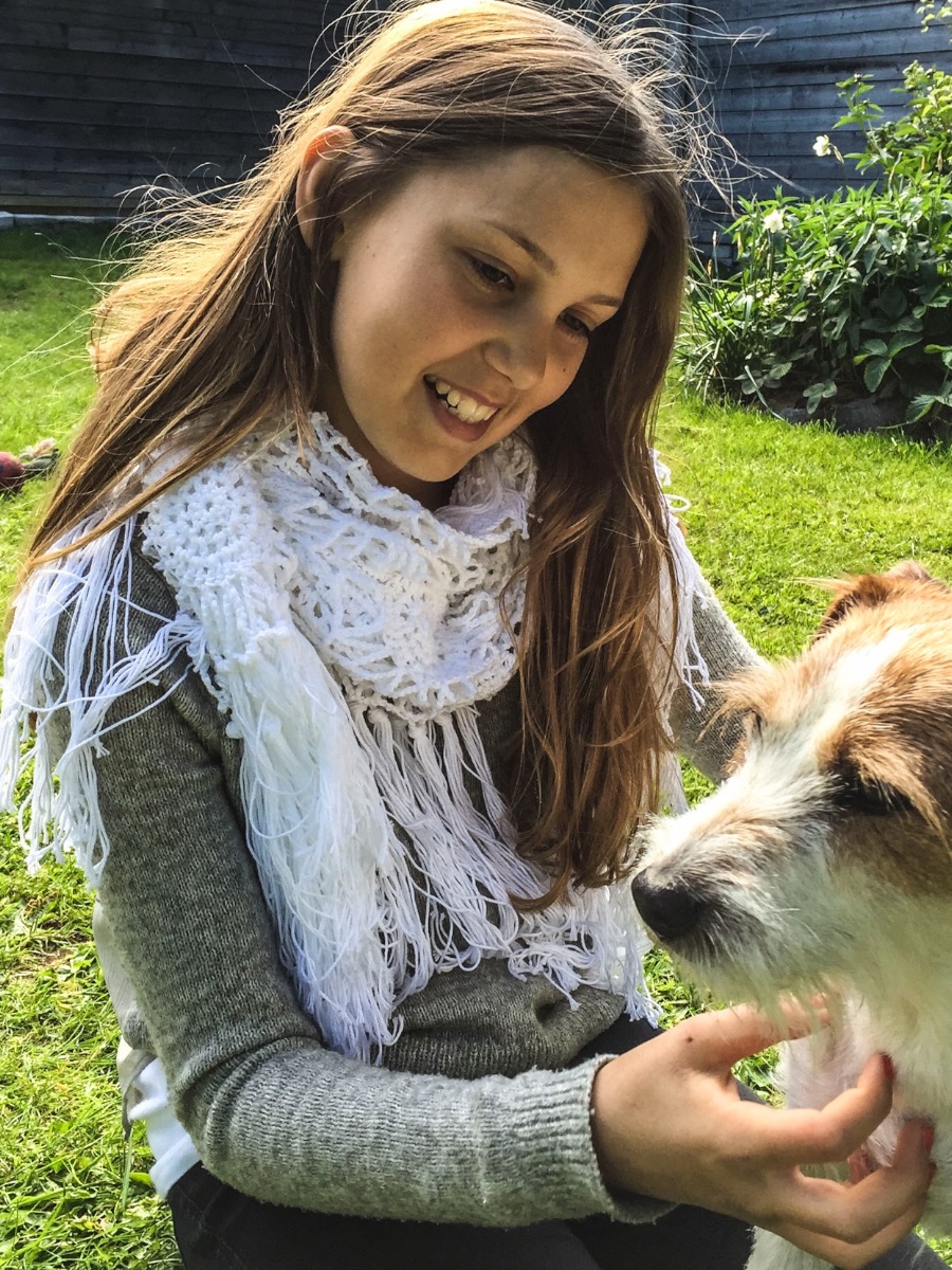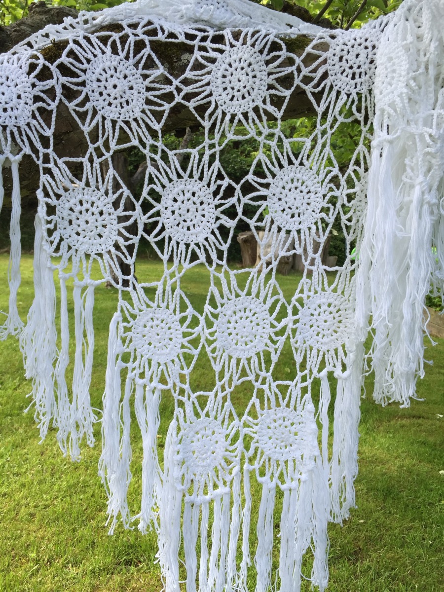 Elegant sjal som bygger på 35 stjärnmotiv som virkas samman allt eftersom enligt en skiss. Varje stjärna startar med en luftmaskring och arbetas i sex varv med allt från fasta maskor till dubbelstolpar. När motivet är sammanfogat skapas en snygg kant upptill med stolpmaskor och baklänges virkade fasta maskor. Sjalen ramas slutligen in med fylliga fransar.