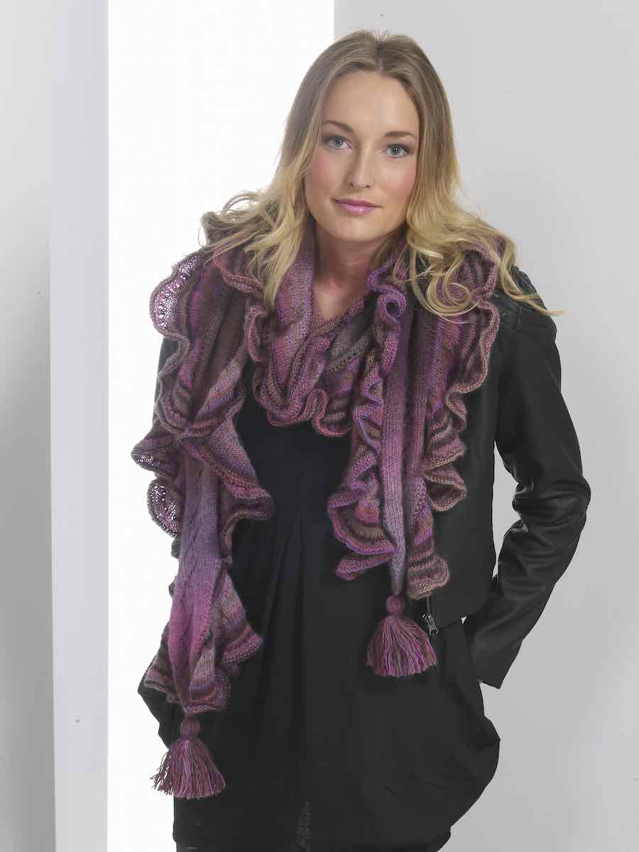 Halsduken stickas i en mittdel med mönster enligt diagram. Längs sidorna plockas maskor upp och volang stickas med ökningar, hålbård och slätstickning. Avsluta med tofsar i ändarna.