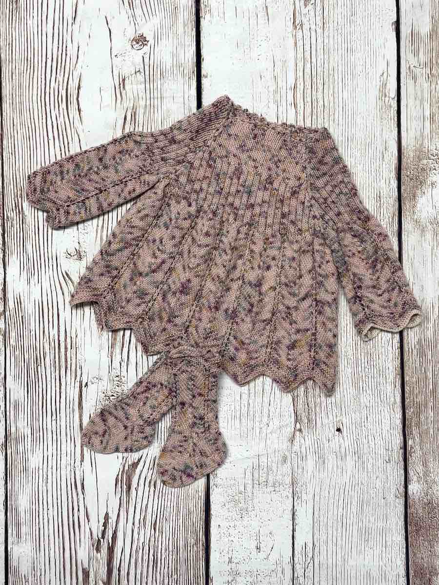 Klänningen stickas i delar som sys ihop. Knäppningen är på baksidan. Sockorna stickas fram och tillbaka på skaftet, resten på strumpstickor.
