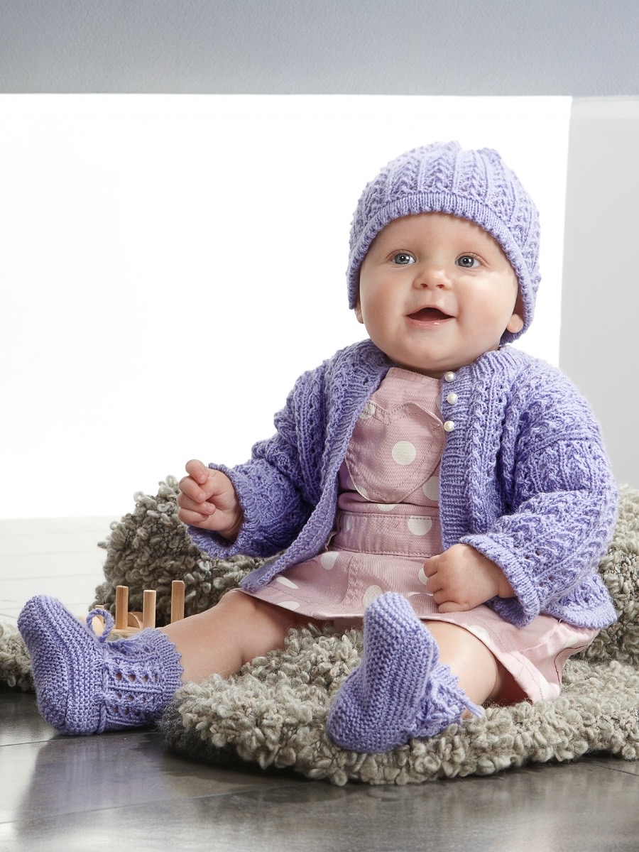 Ett romantiskt set med spetsstickad kofta, linne, mössa och sockor. Koftan får sin karaktär genom ett dekorativt diagrammönster och eleganta hålvarv längs kanterna. Den monteras med tre knappar och har en klassisk passform.