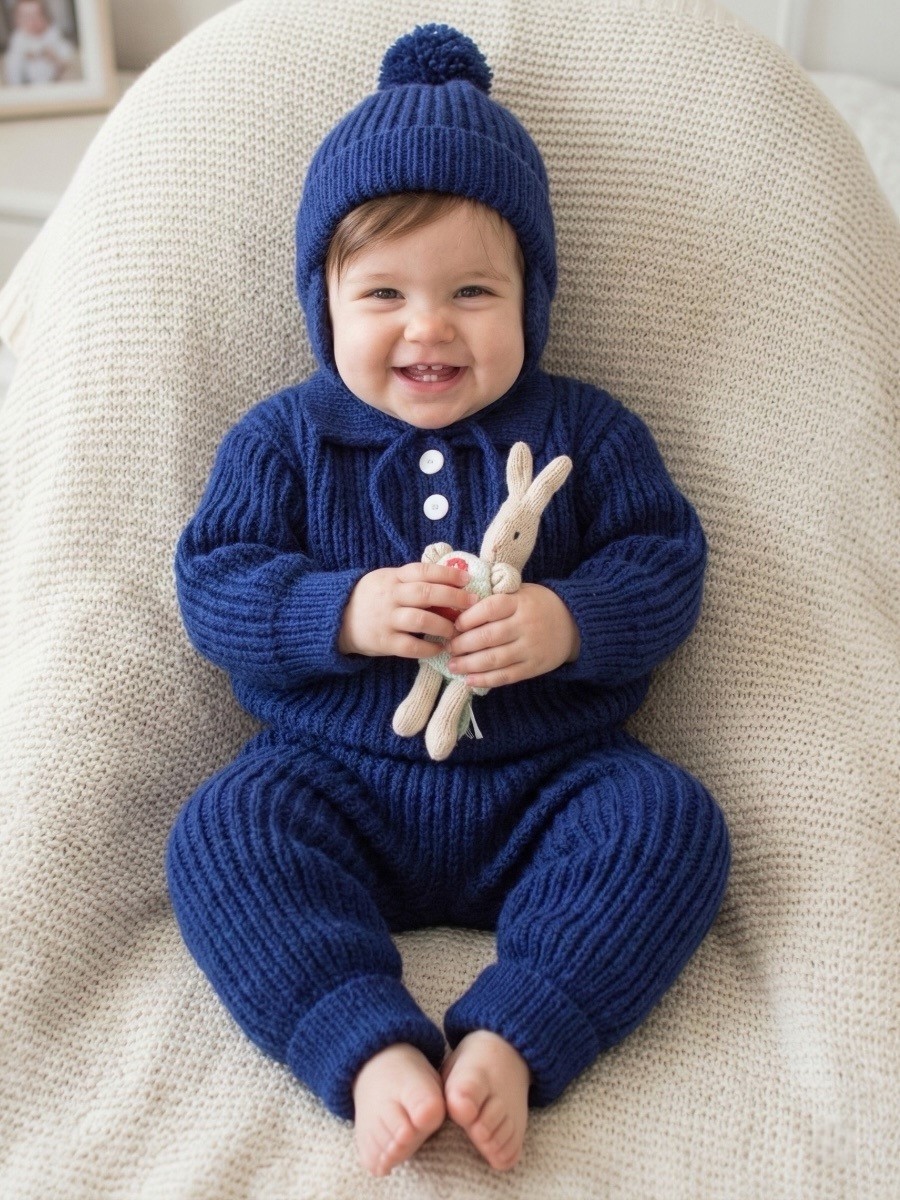Tröjan stickas nerifrån och upp med en klassisk polokrage och knappslå för en fin finish. Byxorna har en hög midja och muddar vid anklarna för bästa passform. Den matchande hjälmmössan stickas med öronlappar och en lekfull pom-pom.