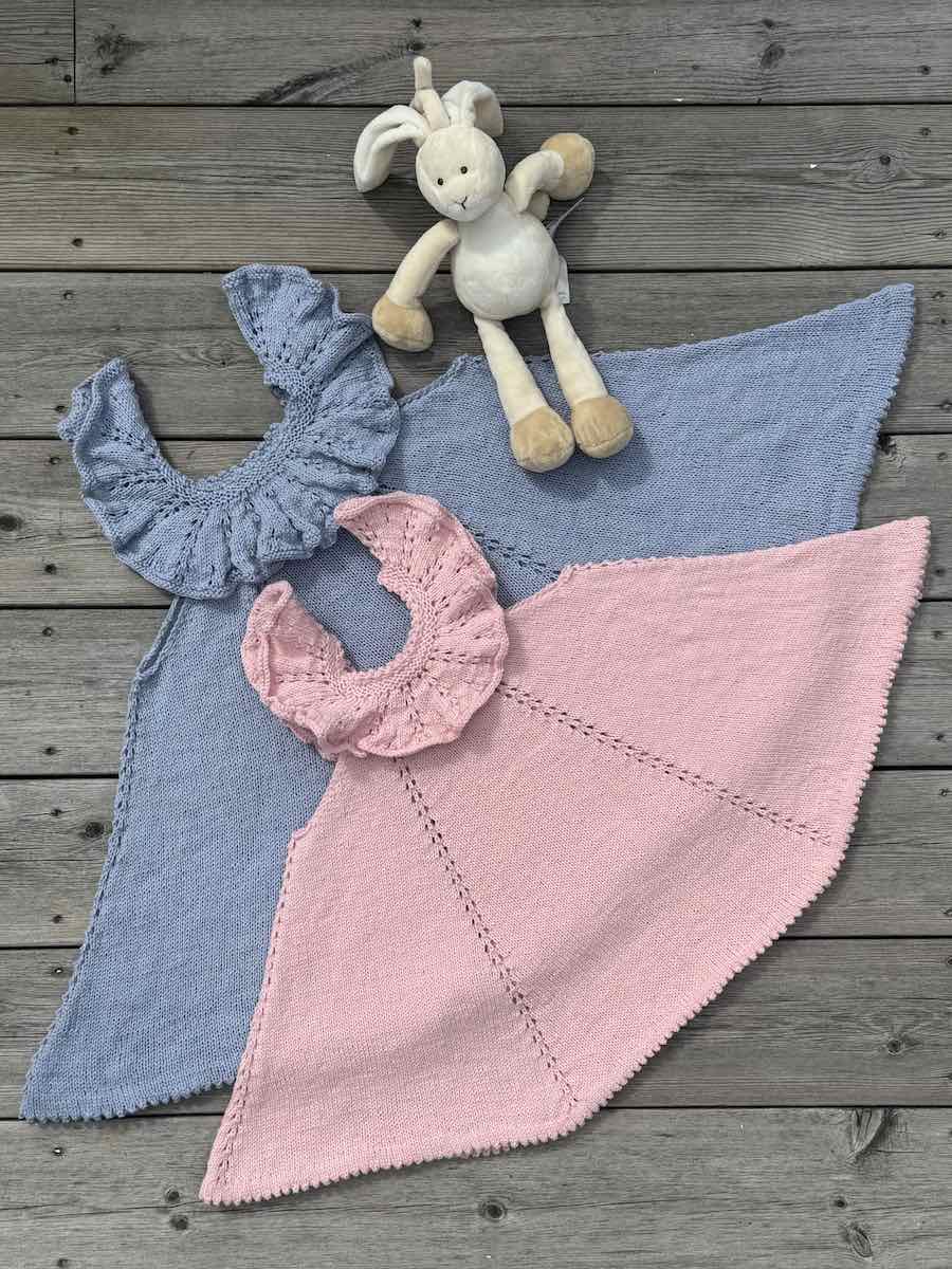 Klänningen stickas runt uppifrån och ner. Kragen stickas efterhand som stickas ihop med klänningen och utgör axelband.