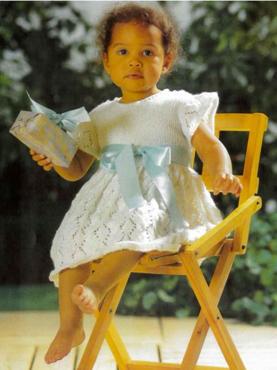 Klänningen stickas uppifrån med bakstyckets axlar som stickas i resår. Delarna sammanfogas och stickas ner till midjan. Kjolen skapas genom en kraftig ökning av maskantalet, vilket ger en fin vidd, och pryds av ett rombiskt hålmönster enligt diagram. Framstycket stickas på liknande sätt med formad halsringning. Slutligen plockas maskor upp för de dekorativa ärmhålskanterna och klänningen dekoreras med knappar och ett band.