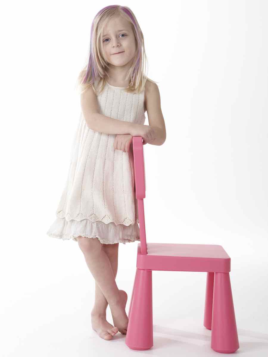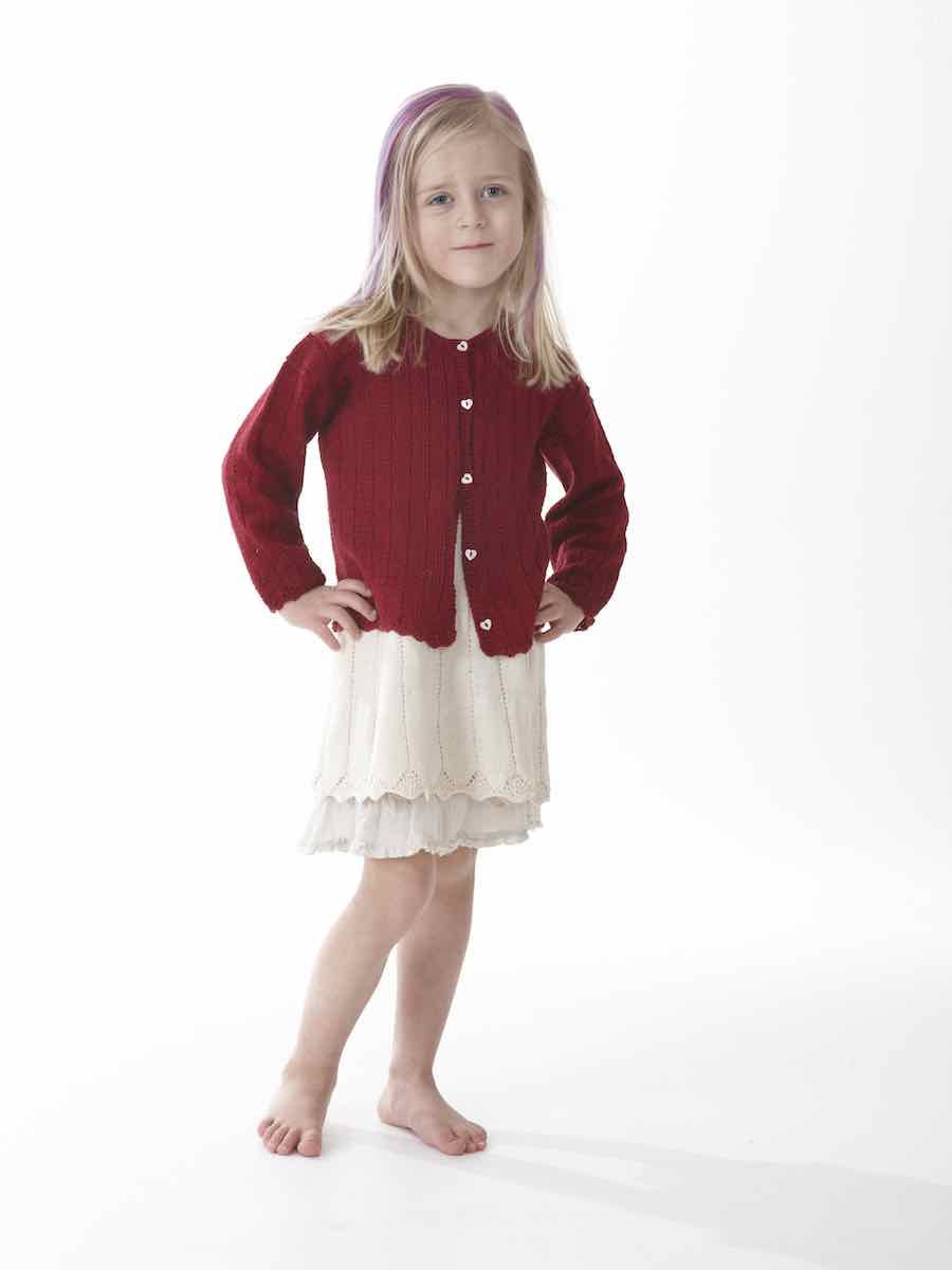 Koftan och klänningen stickas enligt beskrivning och diagram. Sticka rät- och avigmaskor enligt diagram och forma plagget genom minskningar och ökningar för hals, ärmhål och axlar. Montera delarna, sticka kanter i rätstickning och avsluta med knappar.
