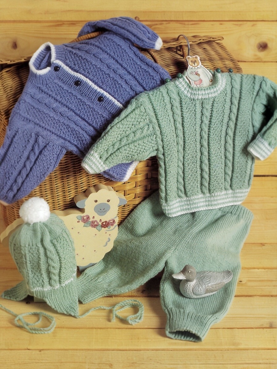 Set med tröja, kofta, byxa och mössa. Byxan har en resårkanal i midjan. Koftan och tröjan monteras med knappar och kräver flätstickningsteknik för sitt dekorativa mönster.