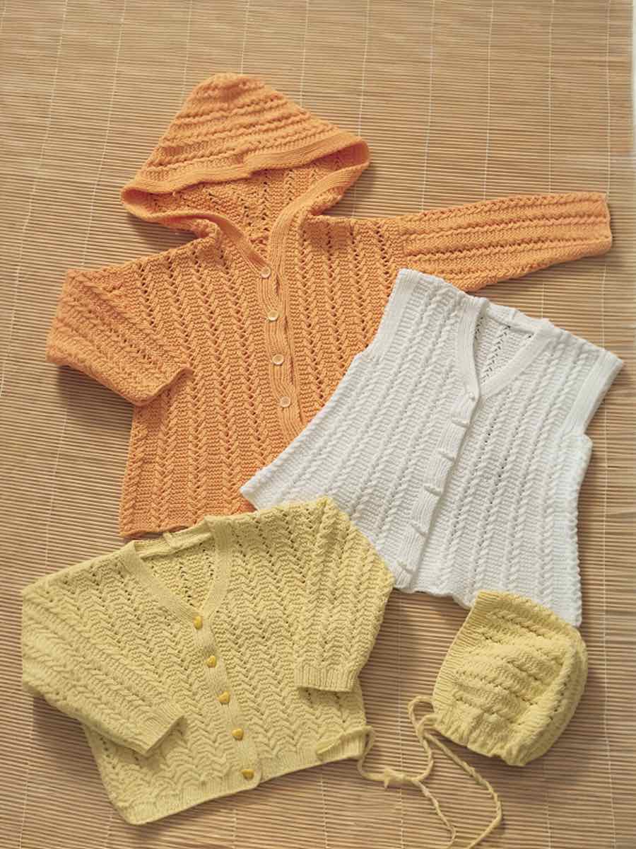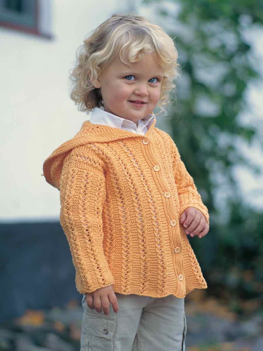 Sticka ett mönsterstickat barnset i bomull med kofta, mössa, klänning och kappa. Plaggen stickas i delar med strukturmönster enligt diagram, formning med ökningar/minskningar och resår. Avslutas med knappslå, virkad kant eller kapuschong.