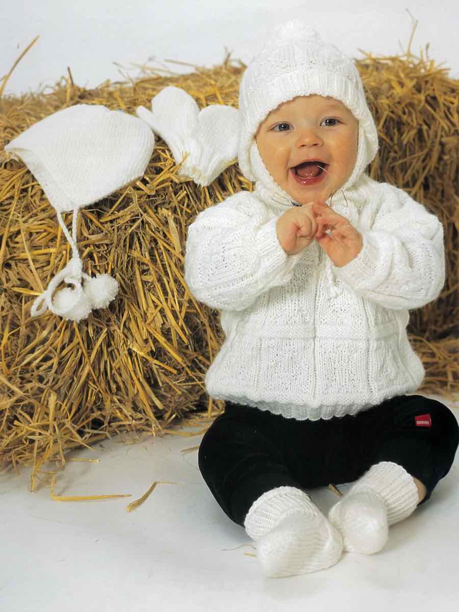 Sticka pullover, mössa, hjälm, vantar och sockor. Följ diagram och beskrivning för bak- och framstycke, ärmar och detaljer.
