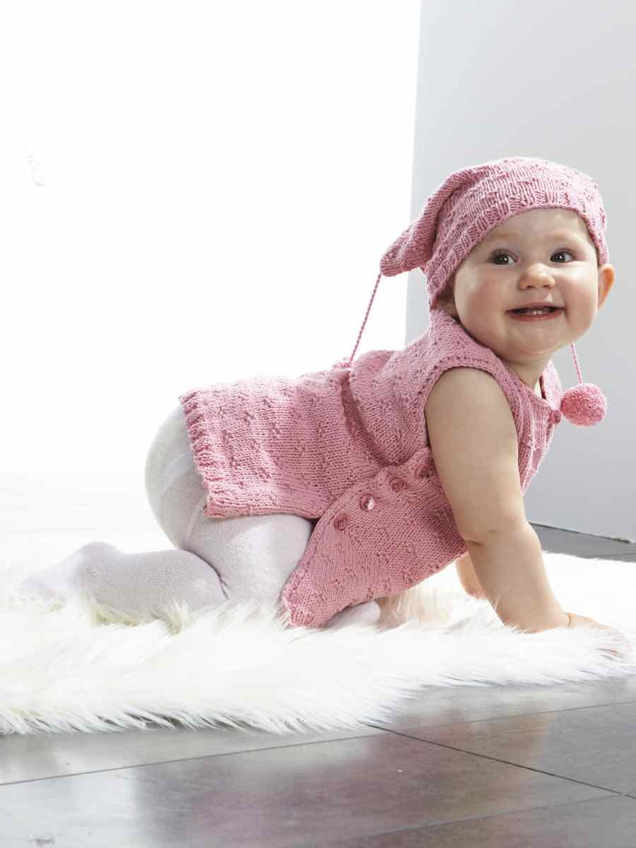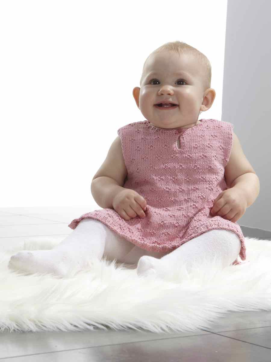 Sticka en förklädesklänning i bomullsgarn med resår och mönster enligt diagram. Delarna formas med minskningar och knapphål. Mössan stickas i samma mönster och sys ihop, med boll- och snodddetaljer. Avsluta med virkad kant och knappar.