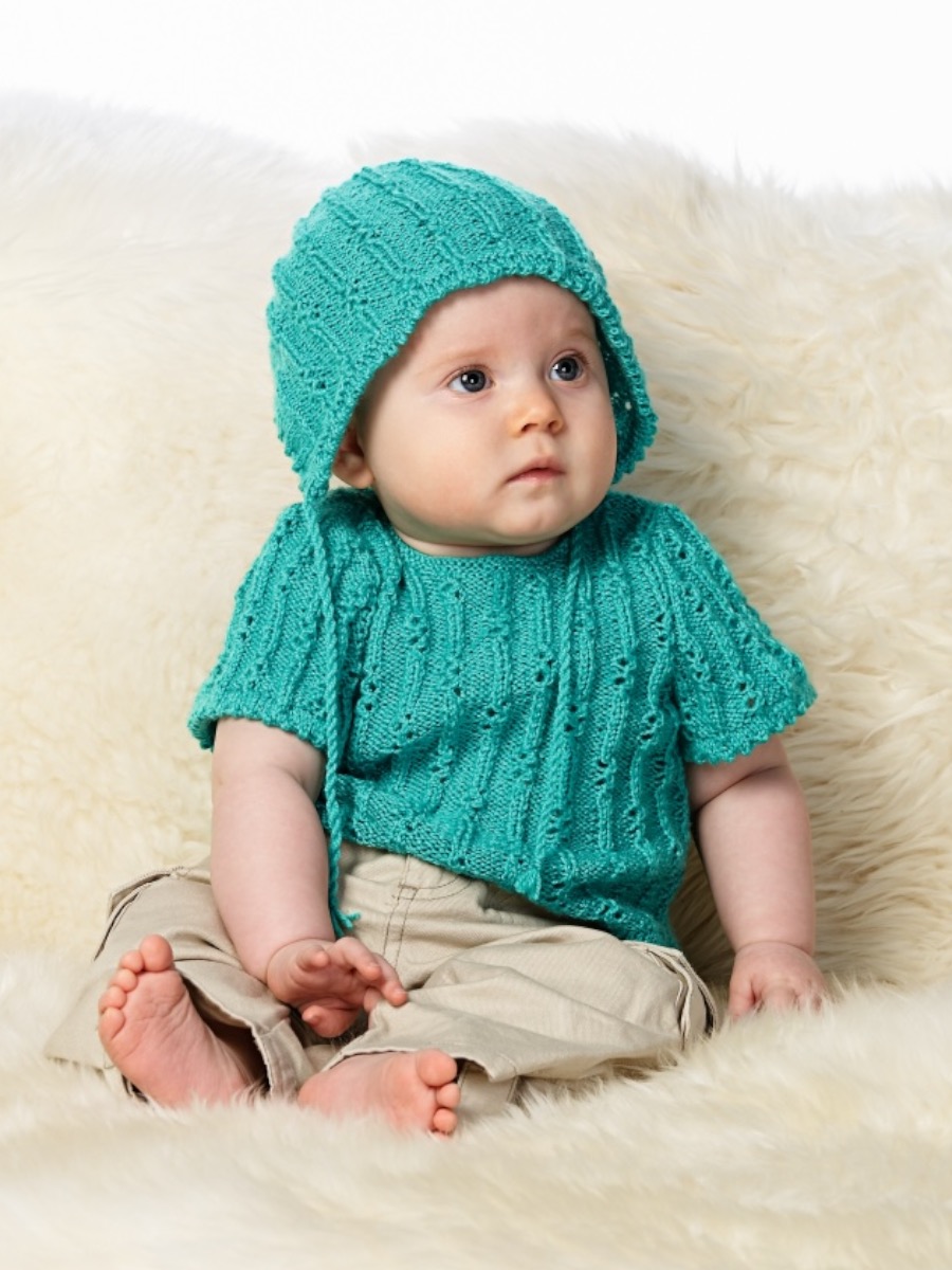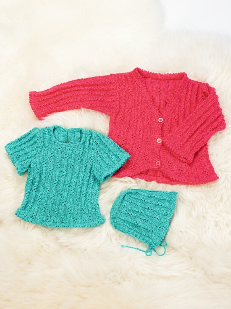 En tröja, en kofta och en matchande hätta, alla utformade med ett dekorativt hålmönster som ger plaggen en mjuk och luftig karaktär.