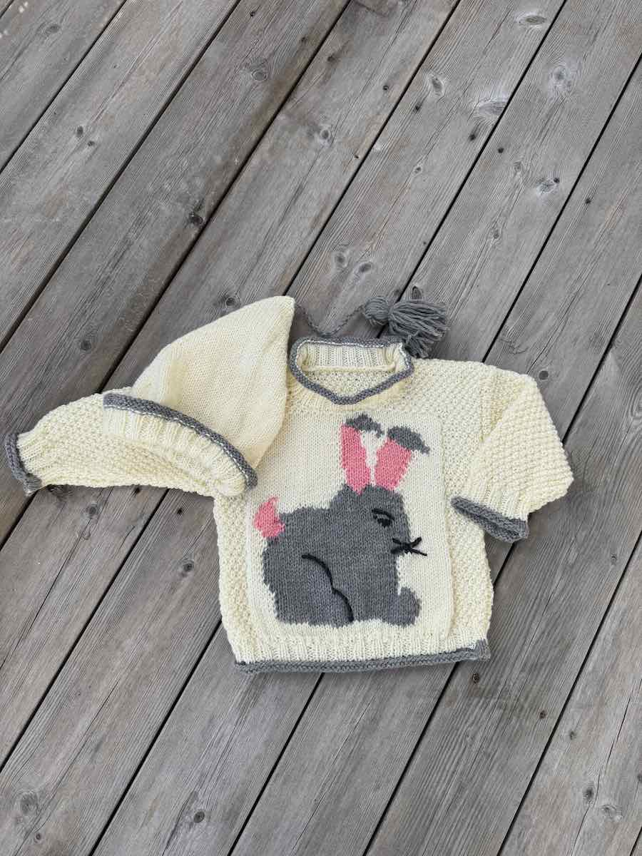 Tröja och mössa stickas i resår, slätstickning och dubbel mosstickning. Tröjan stickas i delar och sys ihop, med dekorativ kant som rullas utåt. Mössan stickas runt och avslutas med en tofs.
