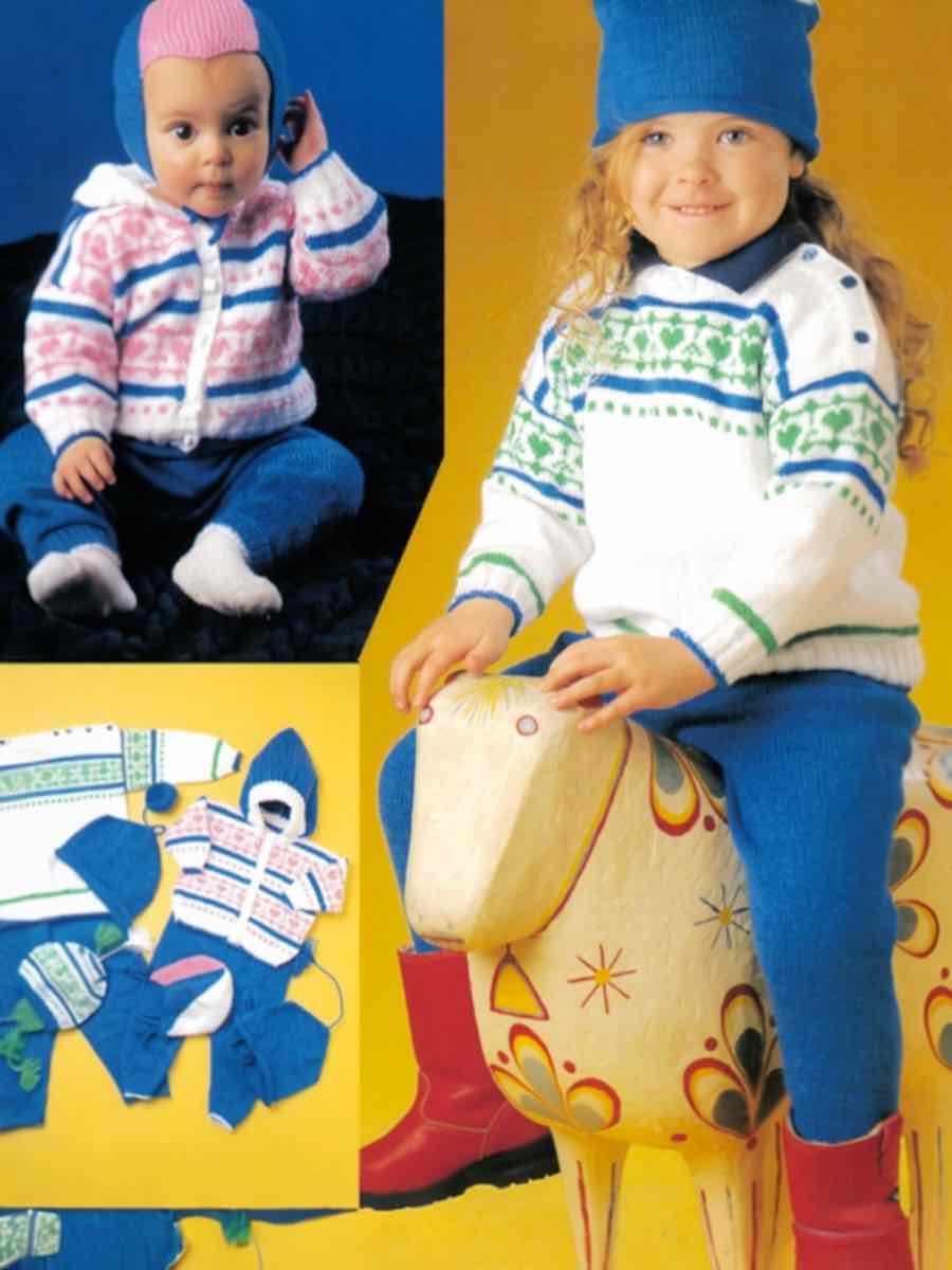 Flera plagg för baby och barn: tröja, kofta, byxa, mössa, halsduk och vantar. Stickas i resår och slätstickning med enkla mönsterinslag och diagram.