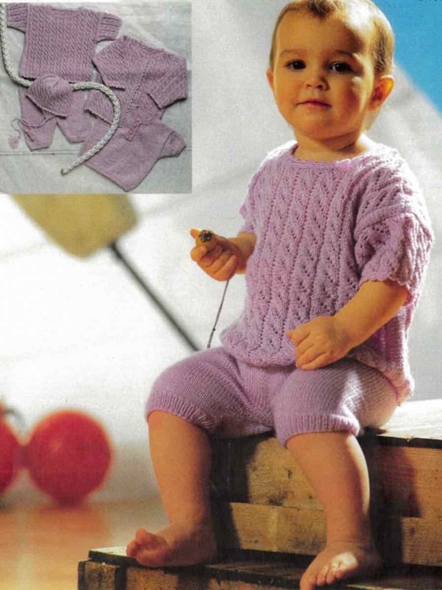 Sticka setet i kofta, jumper, T-shirt, byxa och mössa i rätstickning med enkla ökningar och avmaskningar. Flera delar stickas rakt, andra med resår och enkla mönsterinslag.