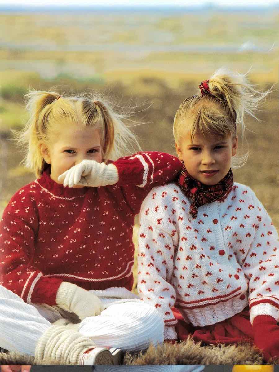 Barntröja och kofta är stickad på traditionellt sett i fyra delar som sys ihop. Resåkanterna är stickad med flätor.
