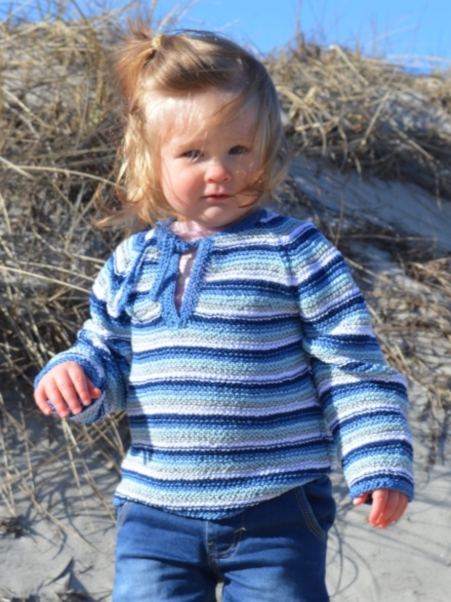 Denna randiga barntröja stickas i flera delar med ett mjukt bomullsgarn. Arbetet utförs i rätstickning, vilket ger en fin struktur och gör ränderna tydliga. Man börjar med bak- och framstycke var för sig, där framstycket delas för ett sprund med snörning.