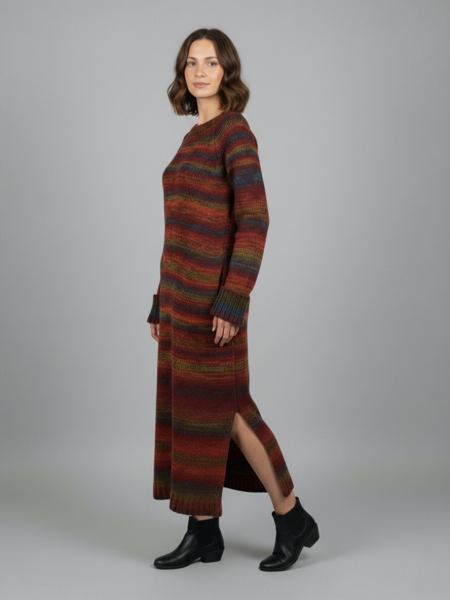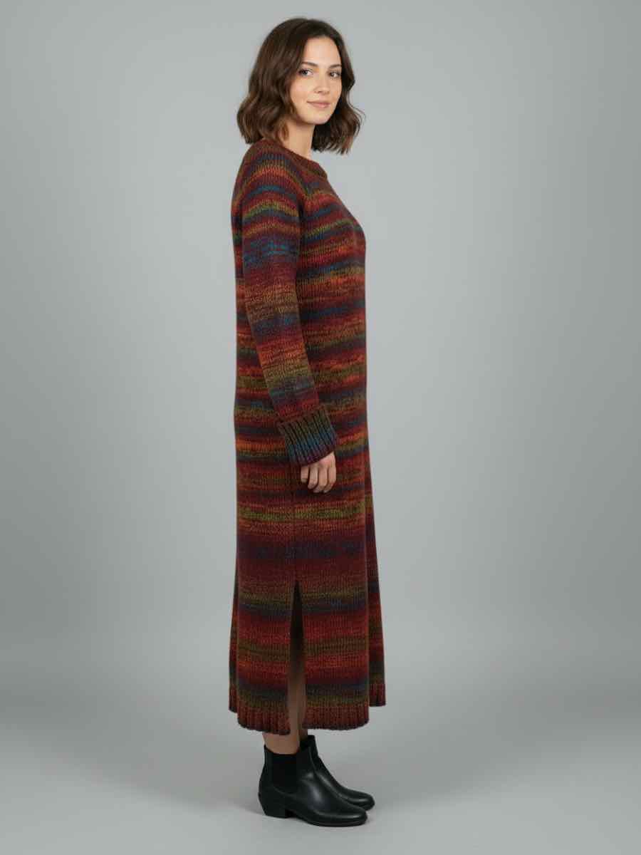 Klänningen stickas uppifrån och ner i dubbelt garn. Börja med resår i halsen och fortsätt i slätstickning med raglanökningar enligt markörer. Dela för ärmar och kropp, sticka runt till önskad längd och avsluta med resår och sprund. Ärmarna stickas separat med uppvikt kant.