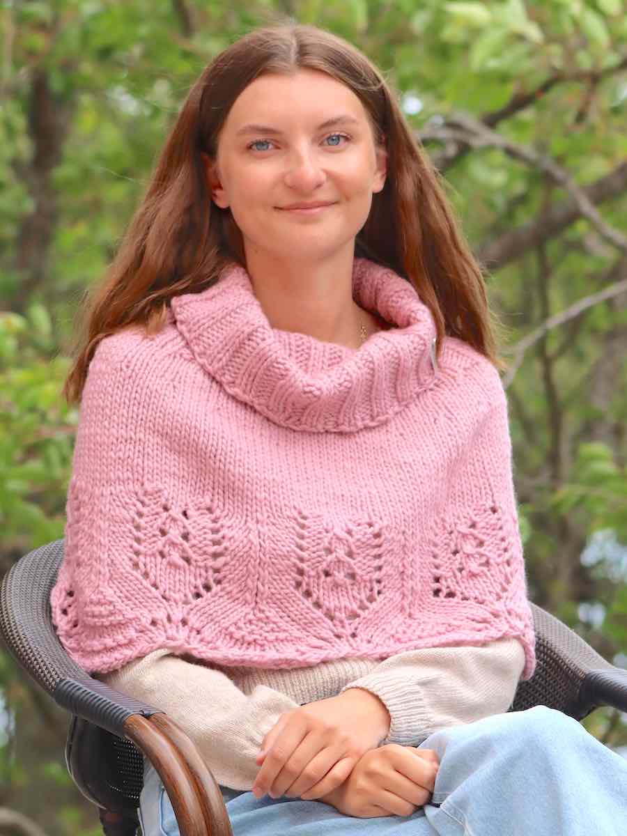 Perfekt höstplagg. Värm axlarna när det blir kallare dagar. Ponchon är stickad i Samo med en fin bård nertill och en stor härlig krage att gosa in sig i.