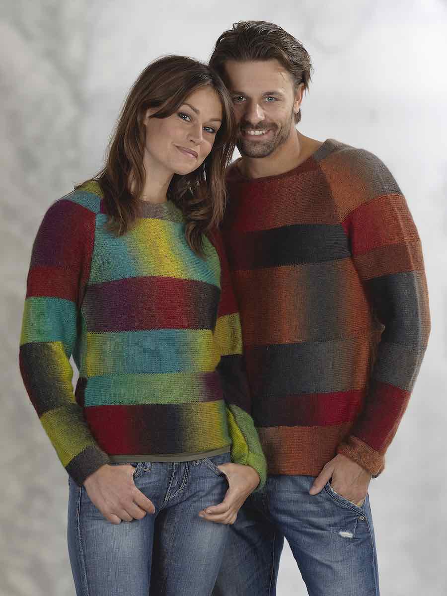 Tröjan stickas i slätstickade band som stickas ihop allt eftersom. Banden bildar mönstret i ombréfärgat garn. Delarna stickas från sida till sida, sys ihop och avslutas med virkad kant runt halsringningen.