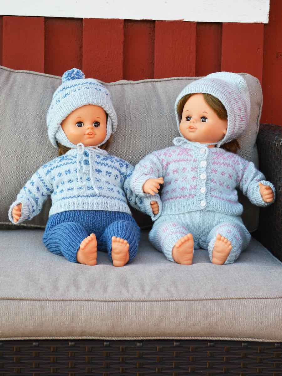 Dockkläder. Plaggen stickas i slätstickning med mönster enligt diagram. Fram- och bakstycken samt ärmar stickas var för sig och sys ihop. Byxa och tights stickas med resår och formning i midjan. Mössorna stickas runt eller sys ihop bak.