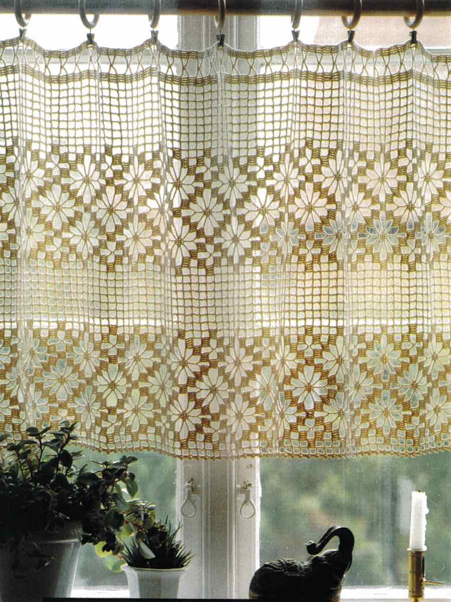 En vacker gardinkappa virkas med stolpar, luftmaskbågar och picoter. Mönstret upprepas i sektioner med ökningar och minskningar för form, vilket ger en dekorativ och luftig spetskant.
