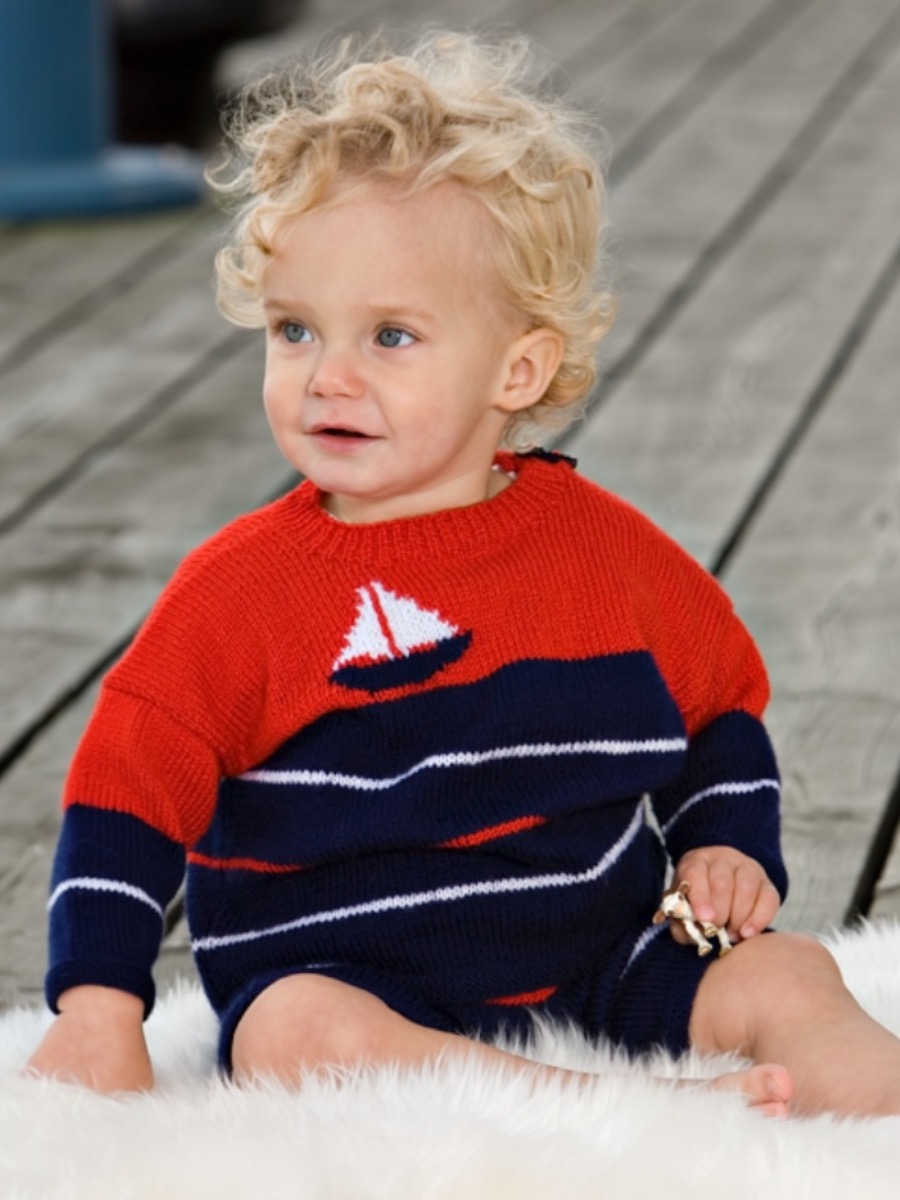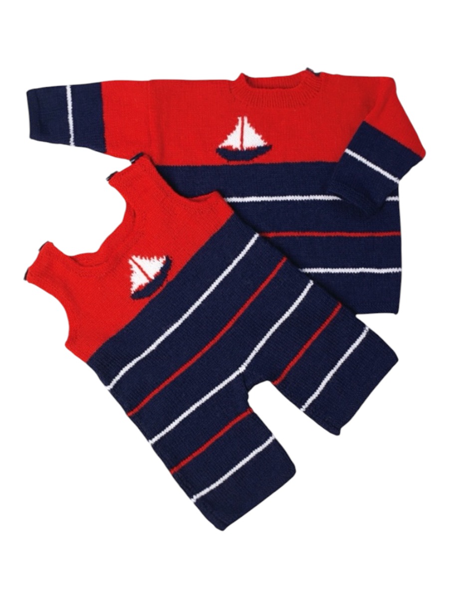 Klassiskt seglarset. Tröjan påbörjas vid bakstycket med en rätstickad kant i rött, följt av en marinblå och vitrandig slätstickning. Framstycket stickas på samma sätt men med en djupare halsringning. Ärmarna stickas separat med ränder och sys sedan fast. Byxan stickas i två delar, med början nertill vid benen. Man skapar en grenkil genom ökningar och minskningar för god passform. Slutligen monteras delarna, och kanter plockas upp runt hals och ärmhål för en snygg finish.