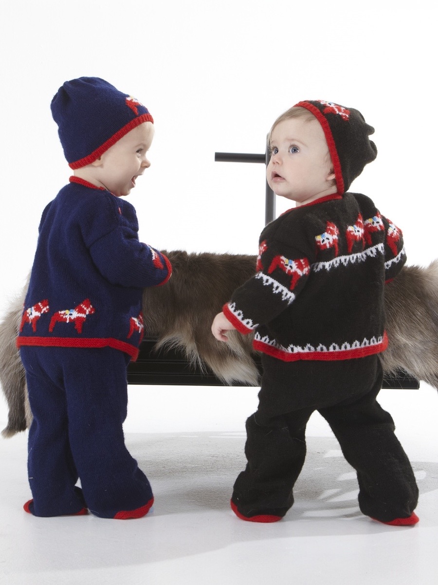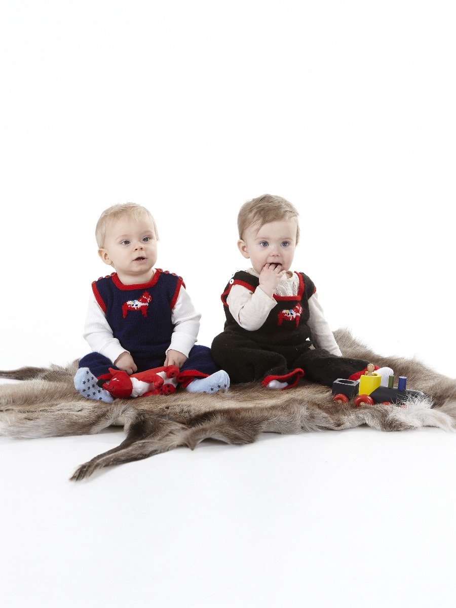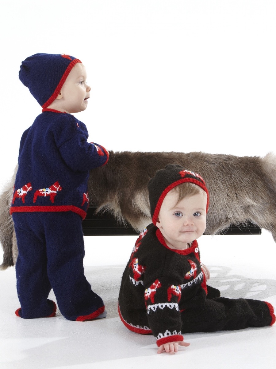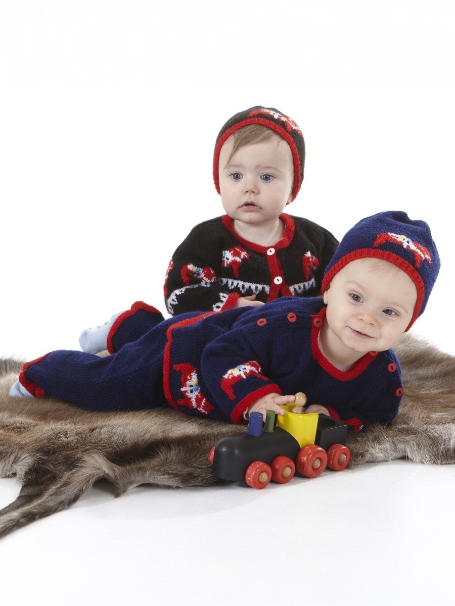 Detta charmiga set i ekologisk bomull stickas med en kombination av rätstickning och ett dekorativt hålmönster. För både klänning och kofta börjar arbetet med en rätstickad kant innan man övergår till mönsterstickning med omslag och hopstickningar. Plaggen formas genom intagningar för ärmhål och halsringning, och klänningen förses med ett praktiskt sprund i bakstycket för enklare påklädning. Strumporna stickas i resår och slätstickning med mönsterdetaljer på skaftet. Slutligen monteras delarna, koftan får nätta knytband och klänningen avslutas med en virkad knapphålsögla.