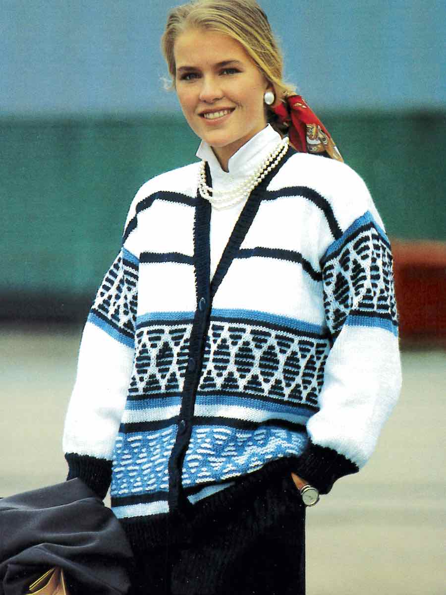 Koftan stickas i resår och mönster med ökningar och minskningar för passform. Fram- och bakstycke stickas separat, ärmar sys på och kanterna avslutas med knapphål.