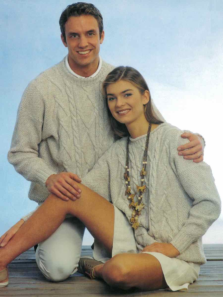 Dam- eller herrjumper med mönsterstickning. Forma hals och ärmar genom avmaskningar. Montera genom att sy ihop axel-, ärm- och sidsömmar för en färdig tröja.