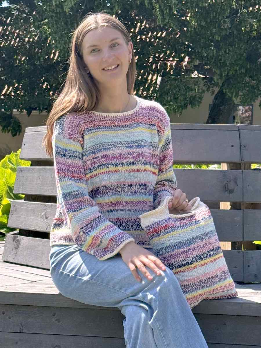 Konfettitröjan stickas i färgglada ränder med varierande nyanser. Mönstret är mångsidigt och omfattar både tröja och matchande kasse.
