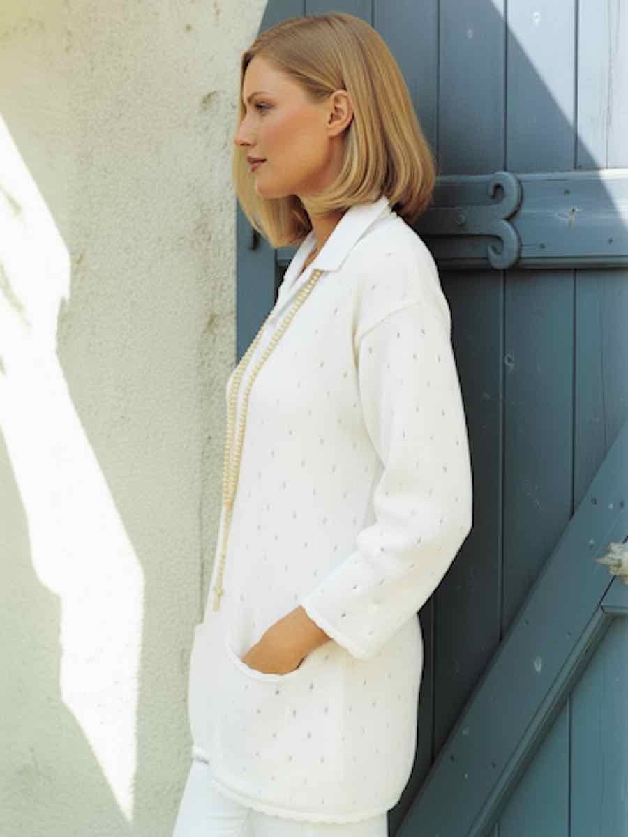Tröjan stickas med en luftmaskkedja i önskad längd. Sticka eller virka sedan enligt mönster: räta maskor, aviga maskor eller stolpar. Följ diagrammet, upprepa rapporterna och forma arbetet genom ökningar och minskningar.