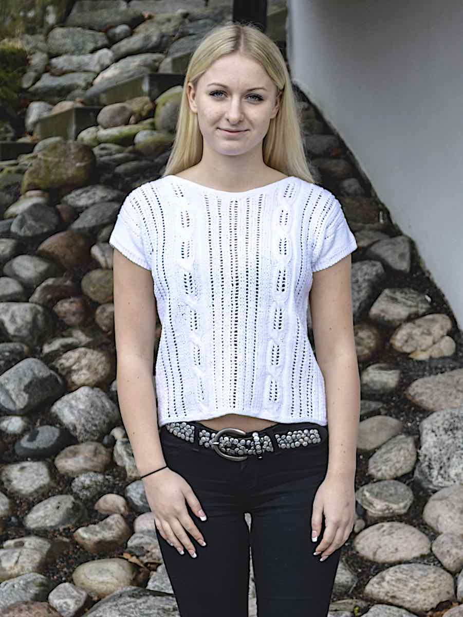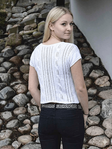 Damjumpern stickas i slätstickning med inslag av diagram. Forma hals och axlar med minskningar. Montera delarna, sy ihop axlar och sidor och sticka en enkel kant runt halsen.