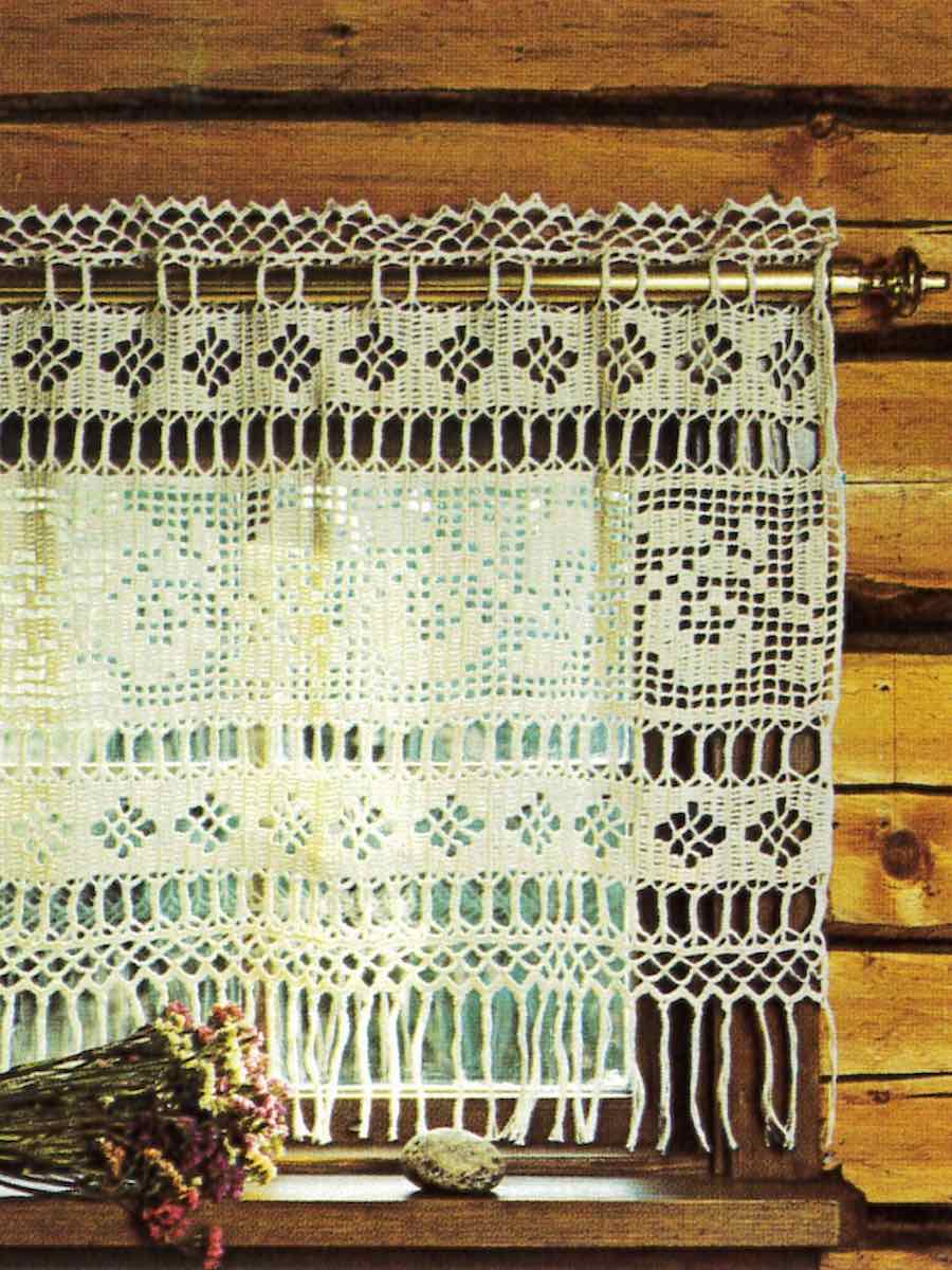 Gardinkappan virkas tätt med luftmaskbågar och stolpar enligt diagram. Börja med ett långt upplägg och arbeta varvvis med ökningar och minskningar som formar rutmönster.