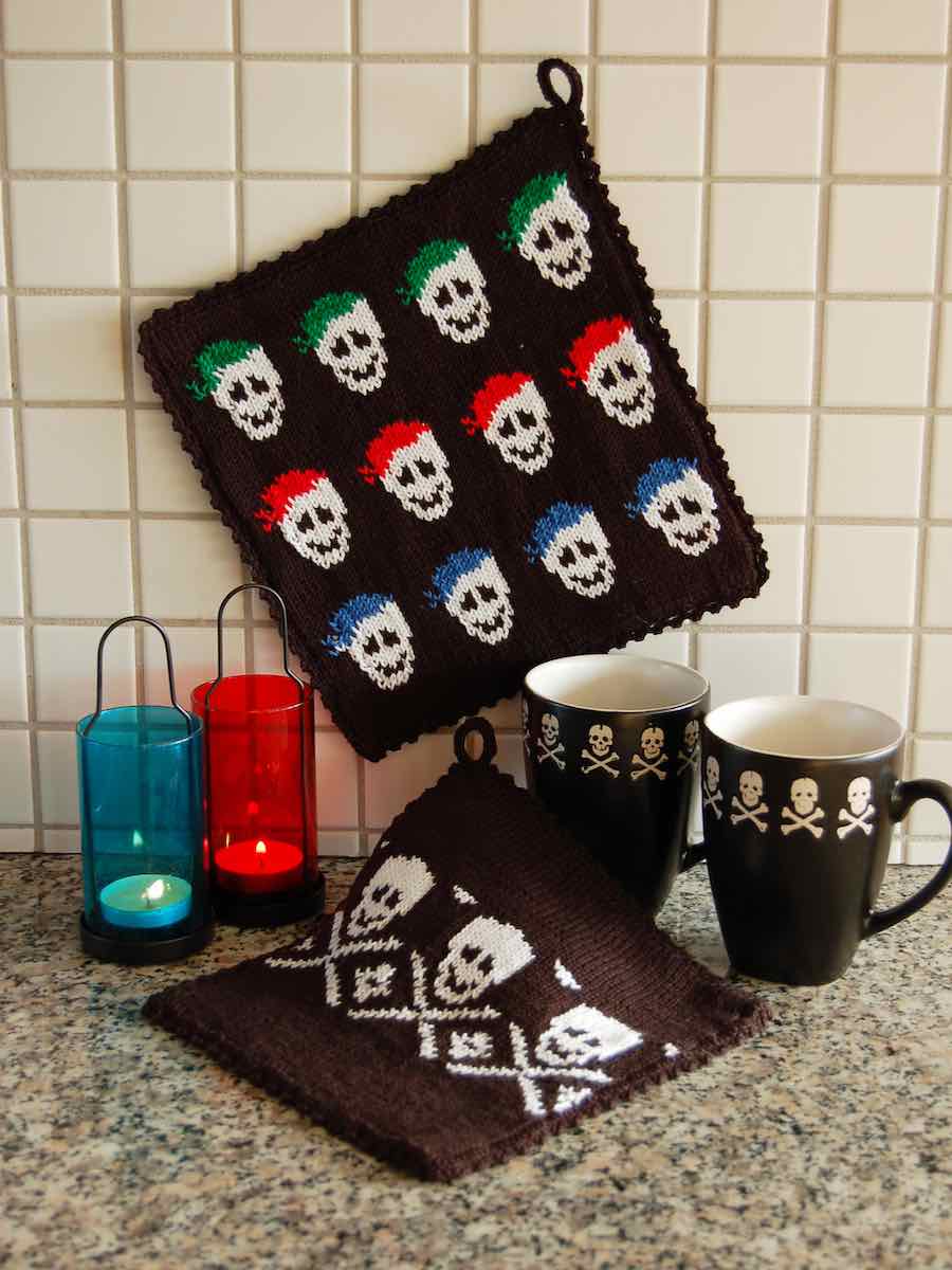 Grytlapparna stickas runt på rundsticka. Grundfärgen stickas i slätstickning och motivet med döskallar arbetas efter rutdiagram. Grytlapparna viks dubbel och virkas ihop med fasta maskor. En upphängningsögla virkas i hörnet och avslutas med en enkel bågkant.