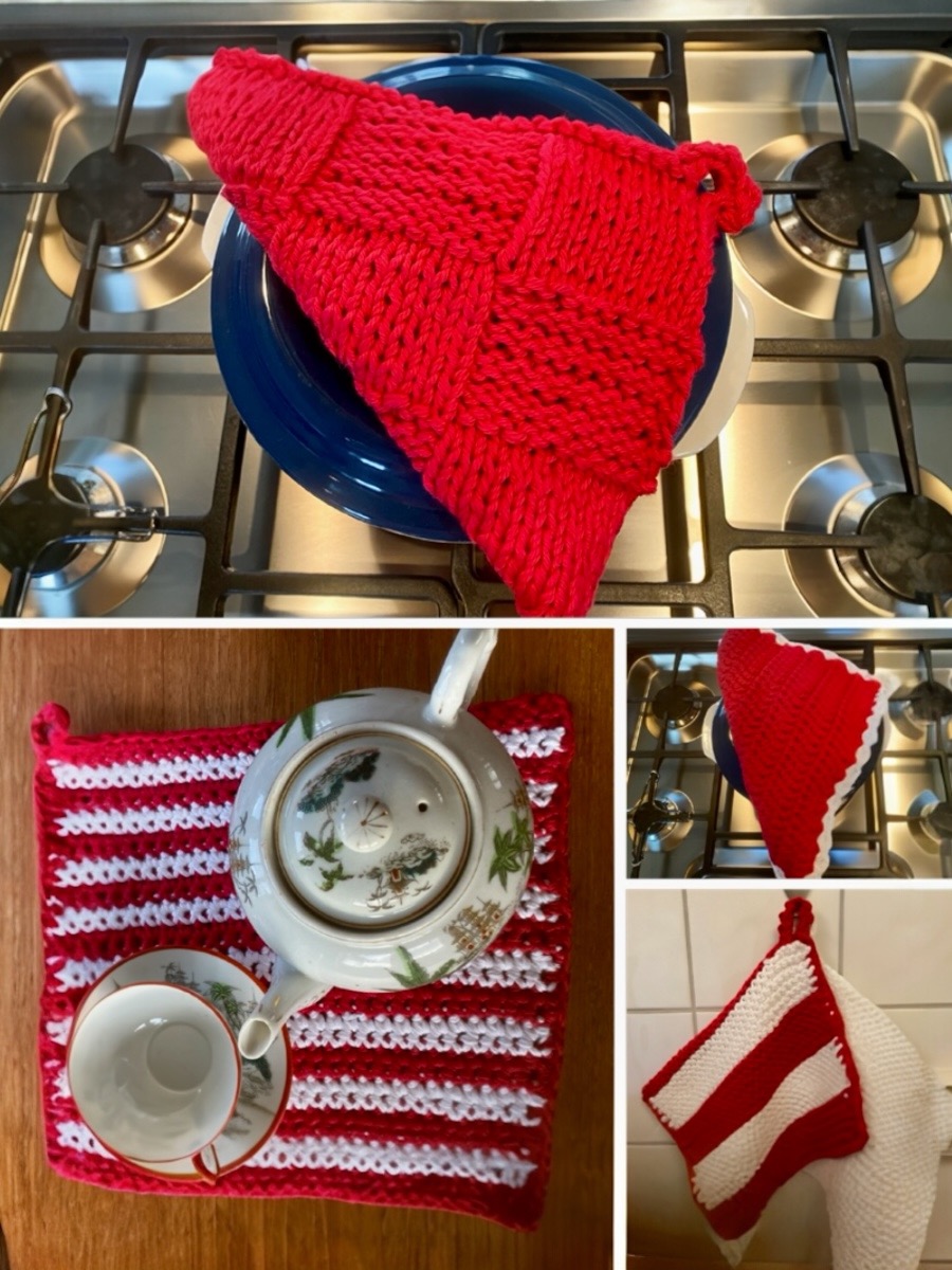 Virkade och stickade grytlappar. Fem olika tekniker att prova. Virka eller sticka i enfärgad eller med två färger.