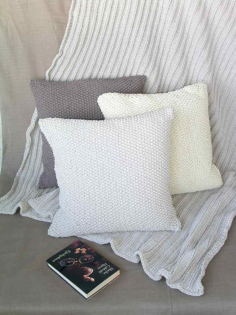 Sticka kudde och pläd i mosstickning med fyra trådar samtidigt på stickor 8 mm. Kudden viks dubbel och sys ihop, pläden stickas rakt och avslutas med fastmaskor runt kanten.
