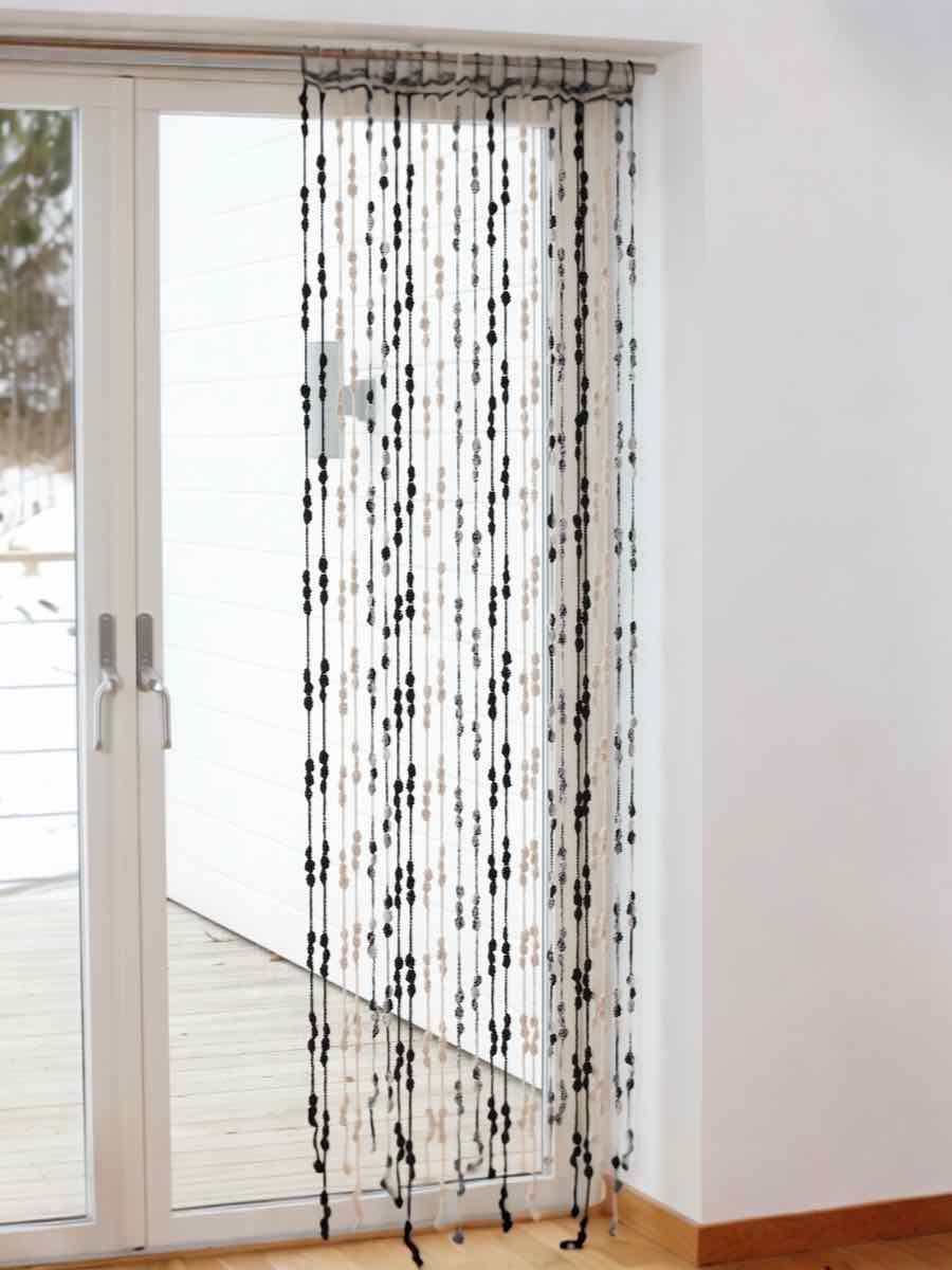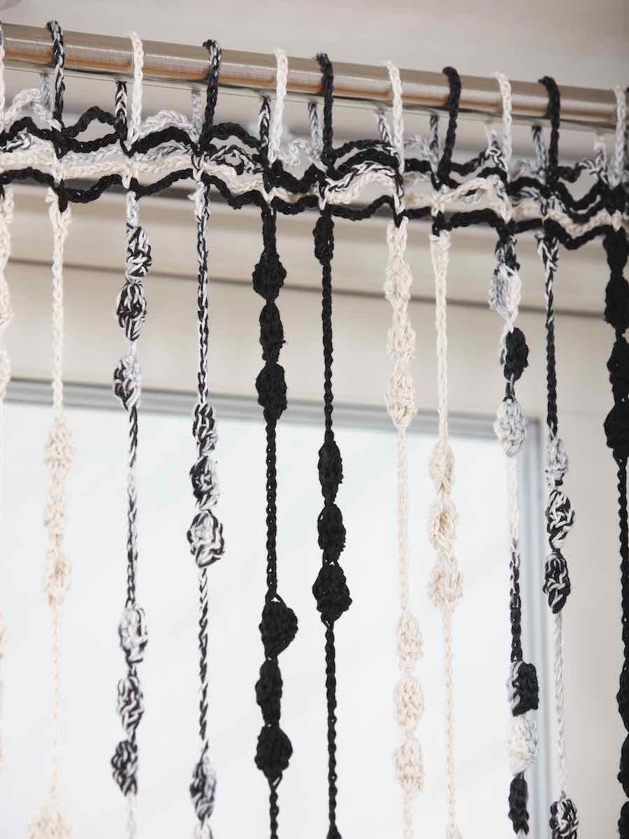 Virkat draperi. Draperiet virkas med dubbelt garn i tre färger. Varje längd består av luftmaskor och dubbelstolpar som bildar mönstergrupper. Längderna virkas separat och fästs sedan ihop med luftmaskbågar upptill. Avsluta med en kant med fasta maskor och hällor för upphängning.