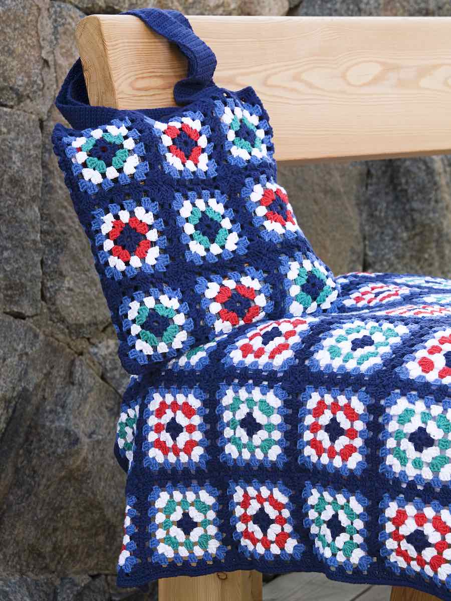 Virka ett färgstarkt överkast och en väska i mormorsrutor. Varje ruta virkas i stolpgrupper och virkas sedan ihop med fasta maskor. Väskan viks dubbel och får axelrem i fasta maskor.