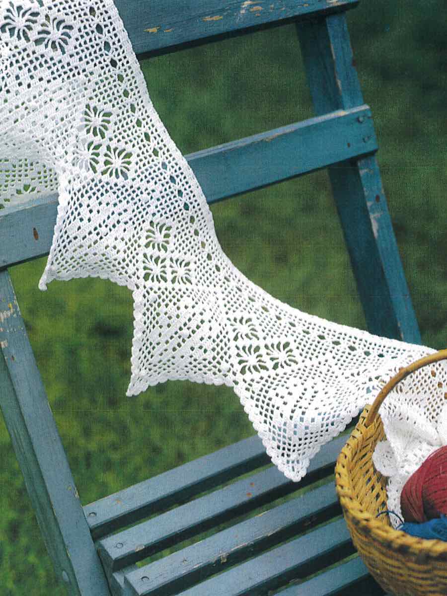 Spetskant som kombinerar stolpar, luftmaskor och muschmaskor. Du följer ett diagram där mönstret upprepas 7 gånger, med ökningar och minskningar som formar spetsens struktur.