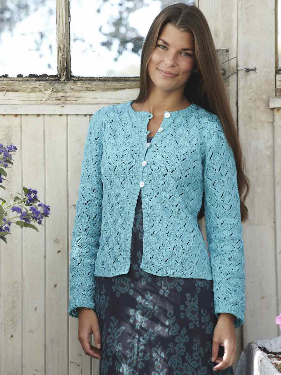Sticka koftan i mönster enligt diagram med ökningar och intagningar för form. Montera genom att sy ihop axlar, sidor och ärmar. Virka knapphålsöglor och avsluta med knappar.