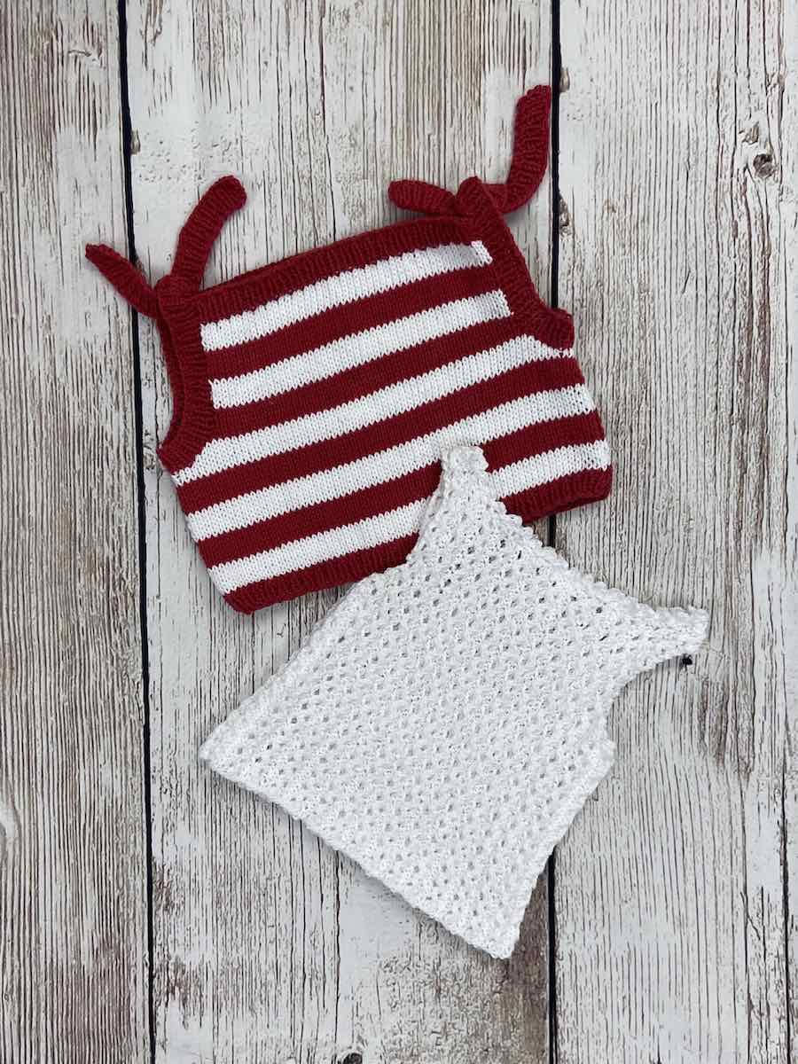 Tunika och linnen, ett enfärgat med spetsmönster och det andra randigt och knyts ihop på axeln. Båda är stickade på traditionellt sett i två delar som sys ihop.