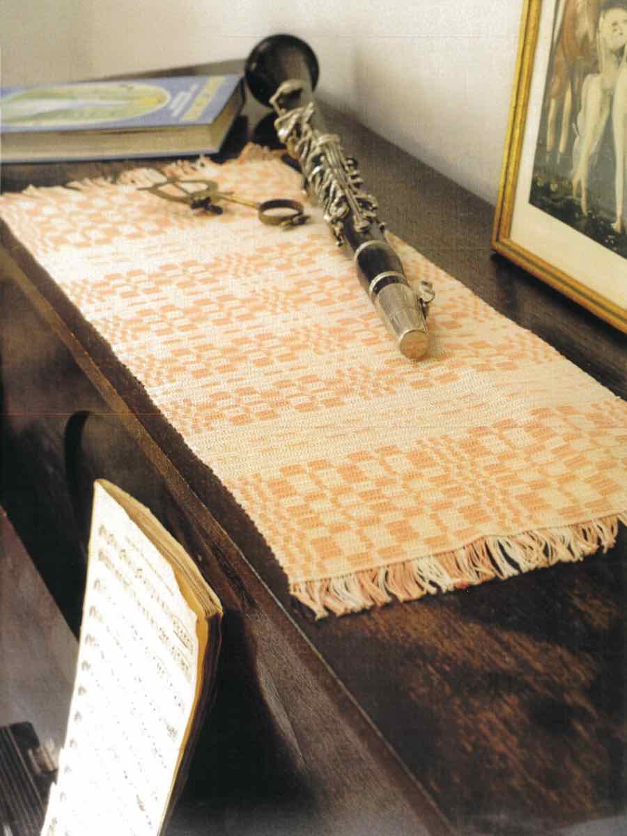 Virkad löpare i två färger med grafiskt rutmönster. Virkas med stolpar och luftmaskor enligt diagram.