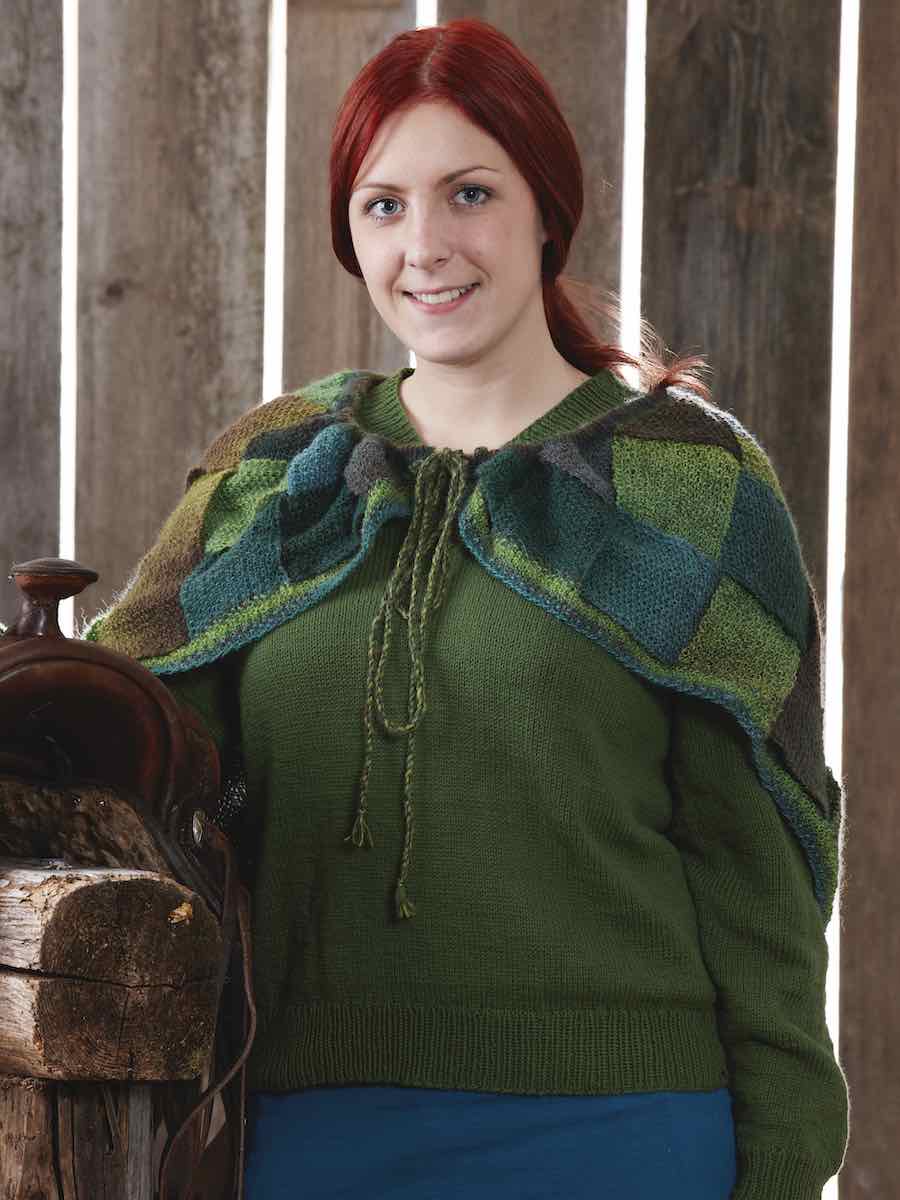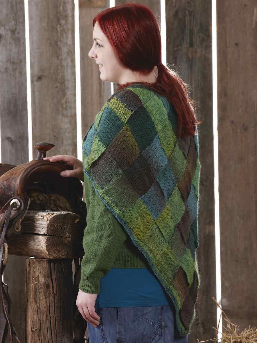 Den mosstickade flätade sjalen stickas i mosstickning på rundsticka. Arbetet börjar med en bred kant, därefter stickas smala remsor som formas med intagningar och flätas samman till sjalens karaktäristiska mönster. Avsluta med en resårkant som viks dubbel och en snodd som träs genom för en dekorativ avslutning.