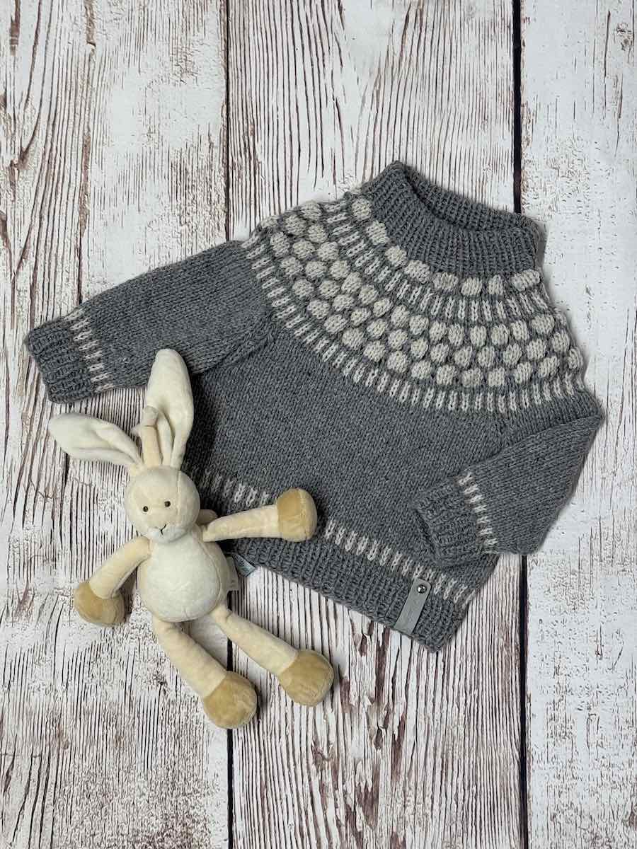 Tröjan är stickad på rundsticka, ärmarna är stickade på strumpstickor. Alla delar sammanfogas och oket stickas med små bubblor.