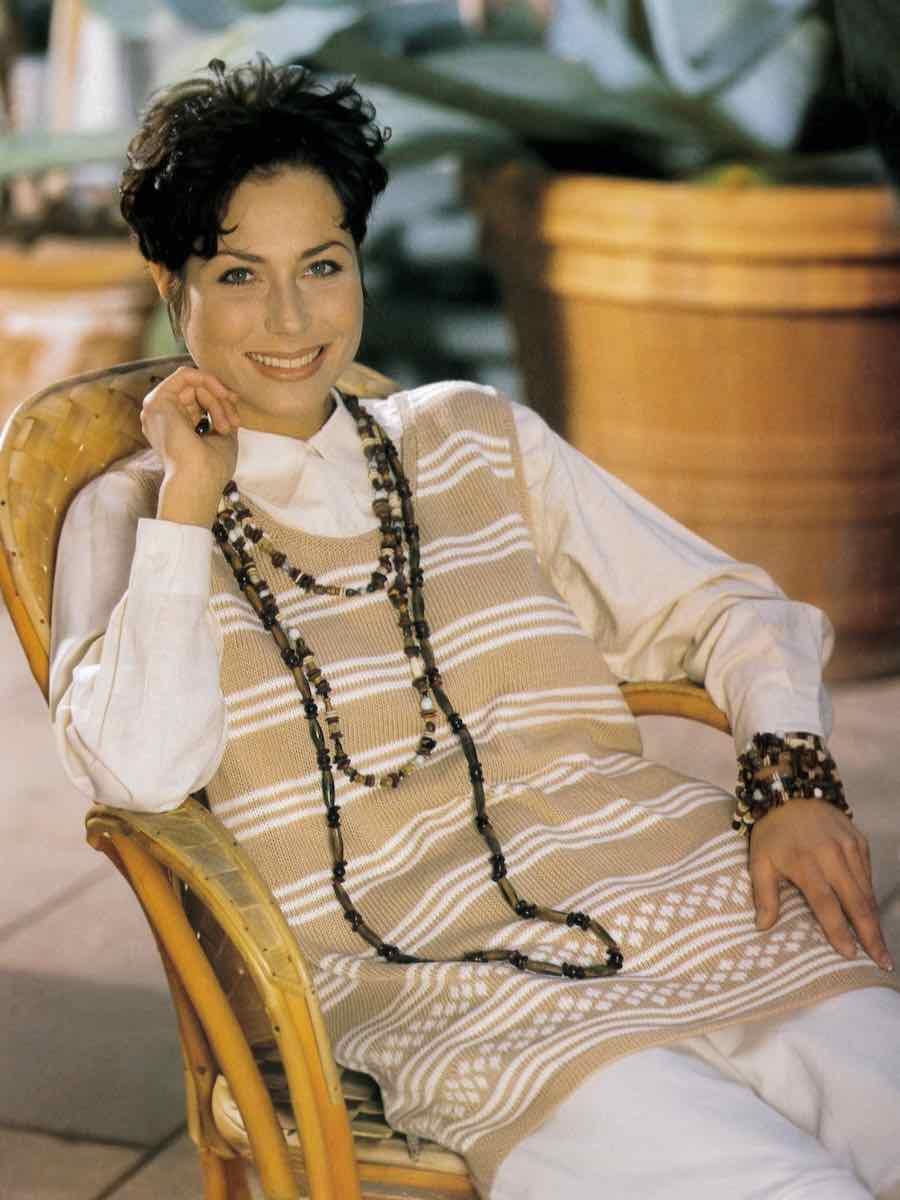 Tunikan stickas i stycken med resår och mönsterstickning enligt diagram. Forma hals och ärmhål med avmaskningar, sy ihop delarna och avsluta med hals- och ärmkant. Montera knappar enligt anvisning.