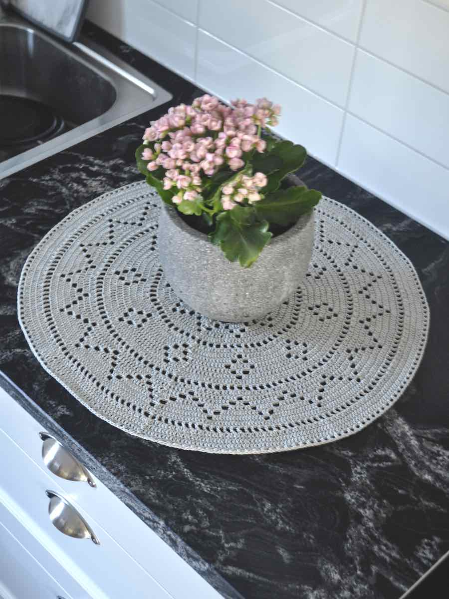 Virkad duk. Börja med 10 luftmaskor och slut till en ring. Virka stolpar runt ringen och öka successivt enligt mönstret. Duken byggs upp varv för varv med luftmaskbågar och stolpgrupper för att skapa ett spetsliknande mönster. Avsluta med ett varv fasta maskor.