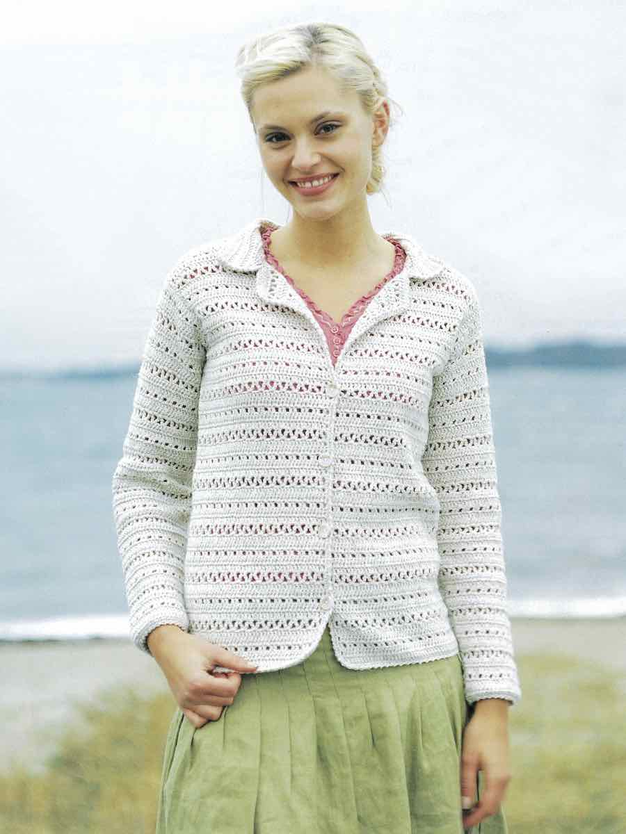Kavajens bak- och framstycken samt ärmar virka var för sig i mönster. Montera ihop delarna, virka krage runt framkanter och hals, avsluta med knapphål och knappar.