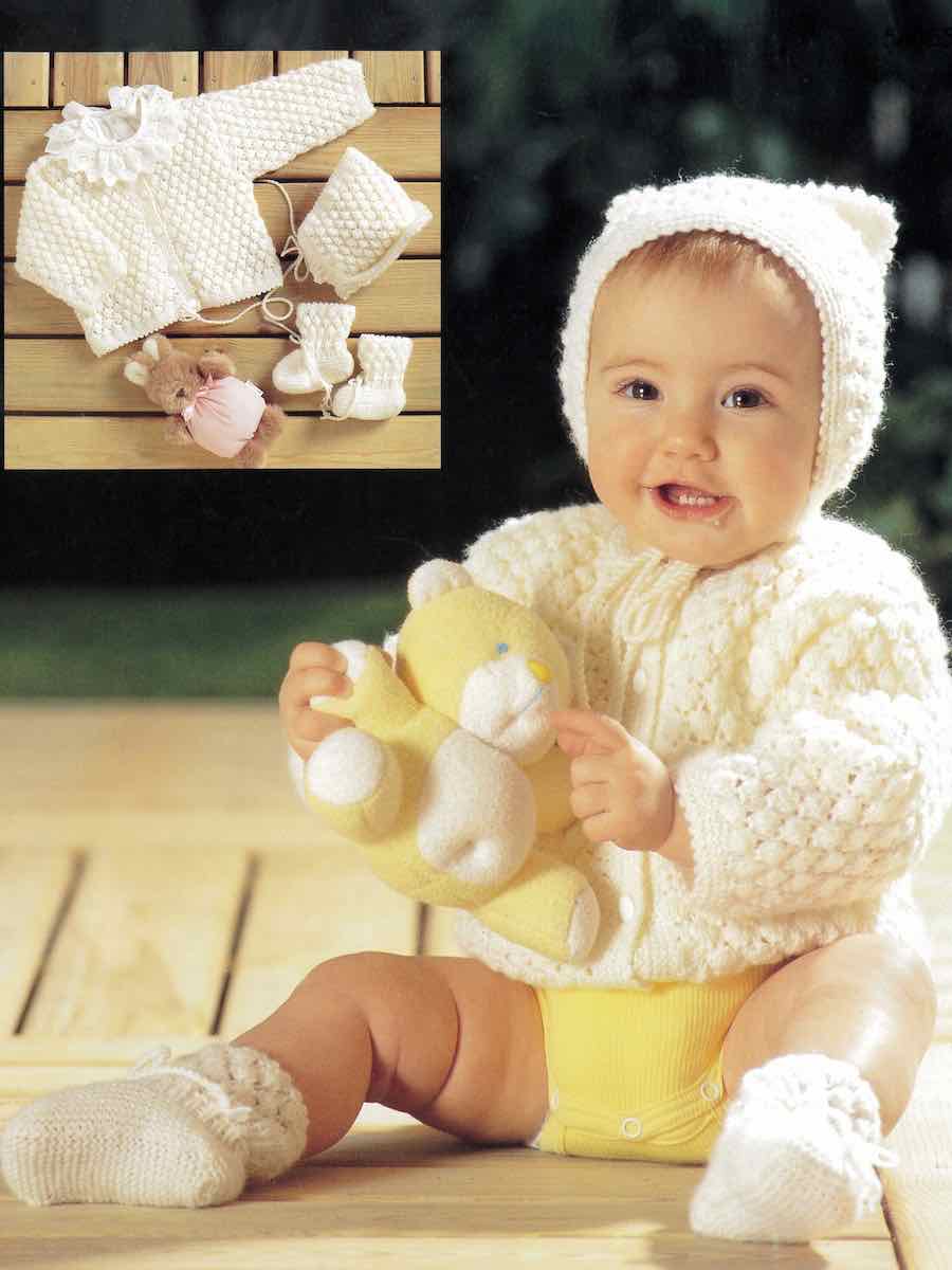 Sticka en söt babykofta med matchande mössa och sockor i mjuk merinoull! Plaggen stickas fram och tillbaka i delar med hålmönster, ökningar och minskningar. Koftan har knappslå, mössan virkad kant och sockorna formad häl och tå.